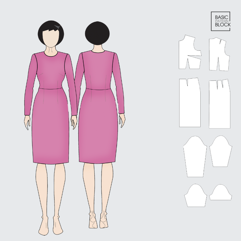 This pattern block includes essential pieces to create a beautiful and tailored midi-length dress: