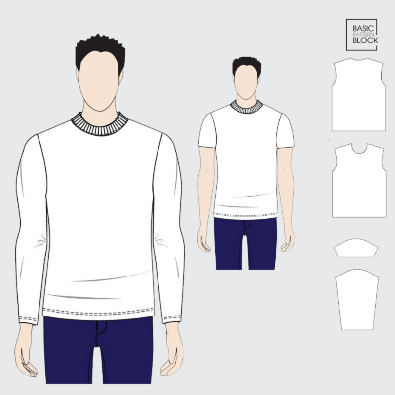 Design a versatile and stylish men’s bodice with both long and short sleeve options using this pattern block. Ideal for knitted fabrics, this pattern is available in sizes XS-6XL and is perfect for creating casual tops and layering pieces.
