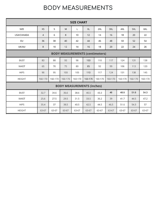 • Sizes: XS-6XL (UK 8-26, EU 36-54, US 4-22, AU 8-26)