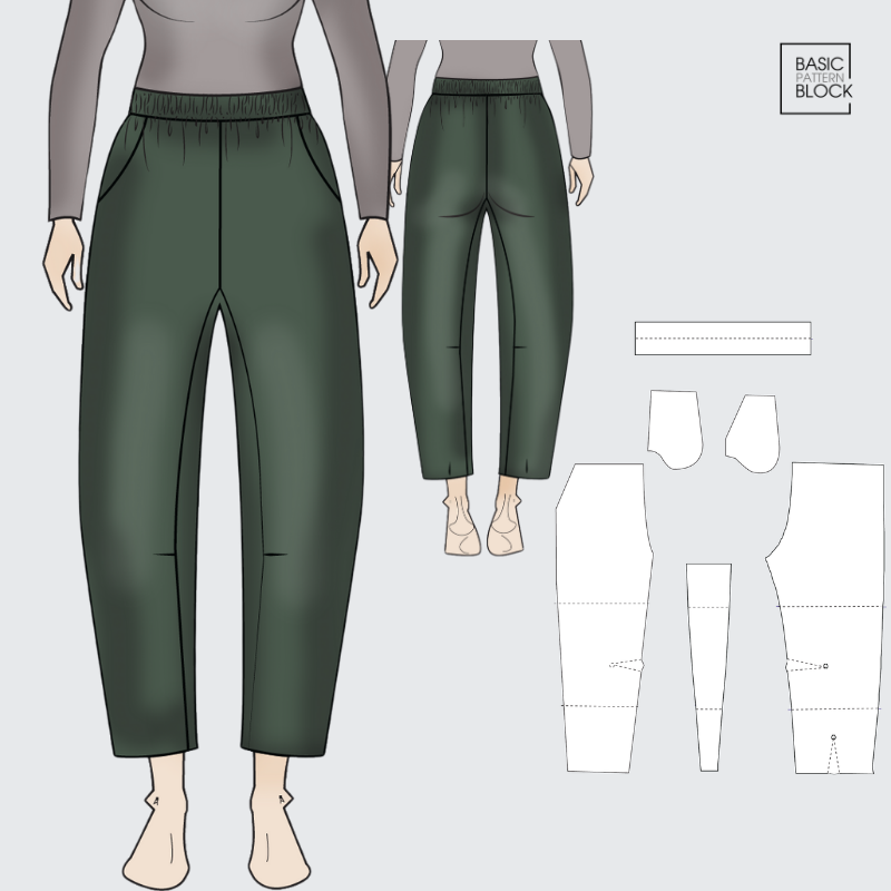 These barrel pants feature a modern, sculptural shape with a curved leg that tapers at the ankle. They sit comfortably at the natural waist with a fully elasticated waistband, offering ease of wear and a flattering fit.